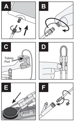 - Position the silicone tubing around the pump wheel, stretching it lightly. Insert the seat cassette into the pump (image D). Close the pump door.