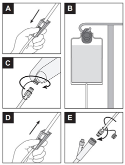 - Open roller clamp and fill set to expel air in tubing (image D). Close roller clamp. NOTE: Do not overfill drip chamber.